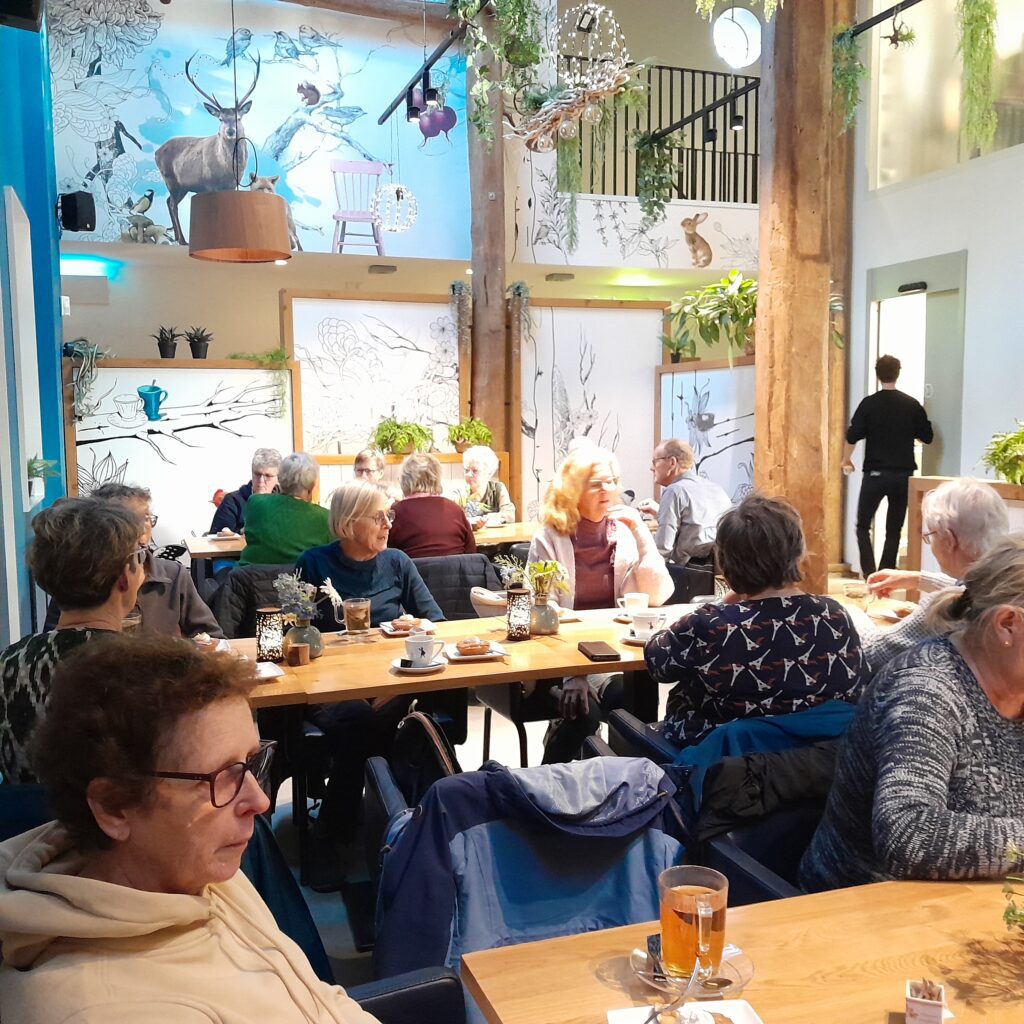 Na afloop gingen we bij De Beum genieten van een heerlijk kopje koffie of thee met een lekker stukje appelgebak erbij. Ook dit was iets speciaals, want een deel van de opbrengst van de taart gaat naar onderzoek van het hart van vrouwen. En dat kwam mooi uit met 21 vrouwen deze middag.